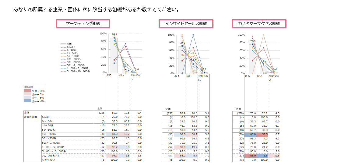 弊社メディックスが、2024年3月にSaaSプロダクトのマーケティング業務に関わった方を対象に実施した「BtoBマーケティング担当者(SaaS)アンケート調査結果」によると、「THE MODEL型組織は多くの企業で存在」しており、特に大規模企業において導入が進んでいることがわかります。このことからも、THE MODELが現代の営業組織における1つのスタンダードになりつつあると言えるでしょう。