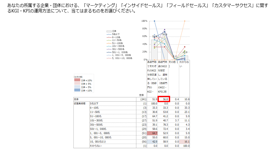 また、先述の「BtoBマーケティング担当者(SaaS)アンケート調査結果」によると、THE MODEL型組織における、KGI・KPIの運用方法について聞いた設問では、56.8%が他部門のKGI・KPIに関与と回答。部分最適ではなく、部門横断でKPIマネジメントが推し進められている状況がみえてきます。