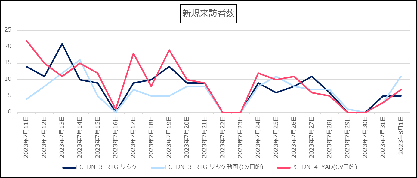 赤のYADキャンペーンが最も多くサイトへ新規ユーザを誘導できていることがわかります。
